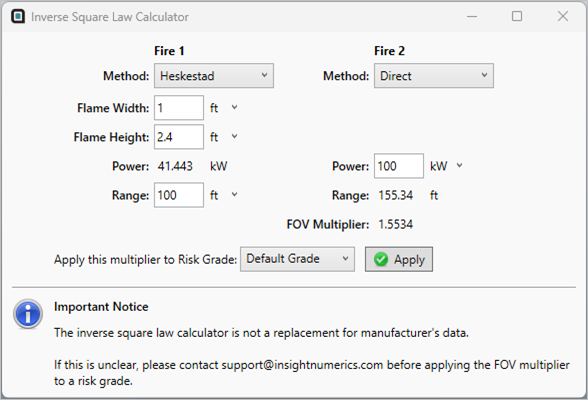 The below shows and example of the Inverse Square Law Calculator using the Heskestad method for determining the power of Fire 1. Either method can be selected for Fire 1 and Fire 2.