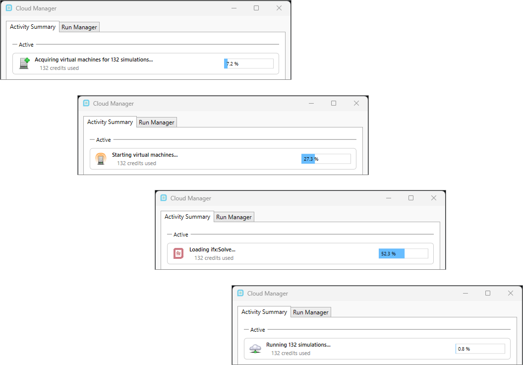 Upon clicking the Run In Cloud button, the Cloud Manager will switch to the Activity Summary tab. It will go through various operations for starting up virtual machines and uploading the cases.