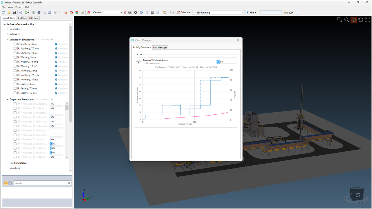 When the simulations start running, you can click the Running 132 simulations... text to expand the progress graph. Here the estimated number of virtual machines needed is indicated with a dotted blue line and the actual number of virtual machines used will appear as a solid blue line. This is expected to change with time as the ventilation cases will run in bulk first, followed by the dispersion cases. Over time we will see a darker blue line appear indicating total progress of the computation of the project.